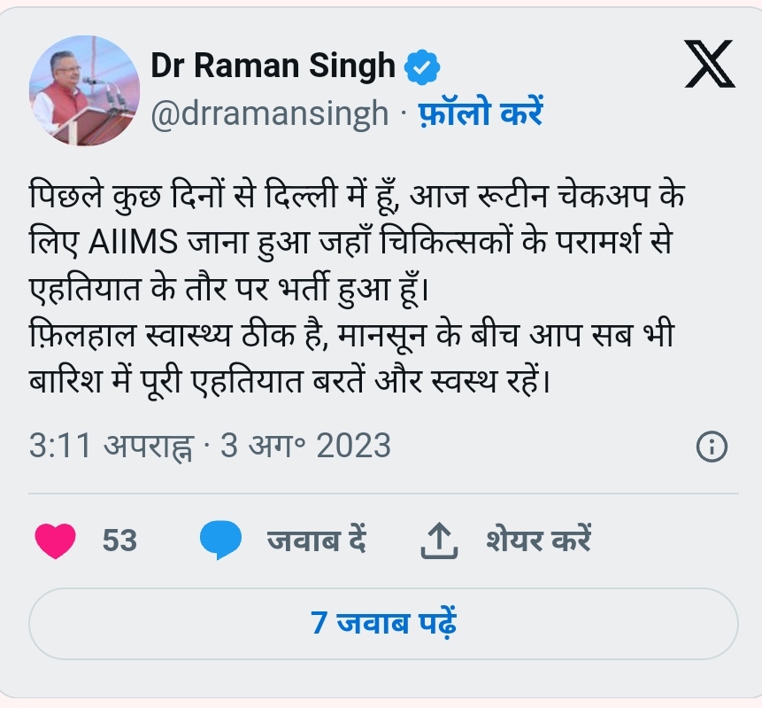 डॉ. रमन सिंह ने ट्वीट कर लिखा कि पिछले कुछ दिनों से दिल्ली में हूं, आज रूटीन चेकअप के लिए AIIMS जाना हुआ, जहां डॉक्टरों के परामर्श से एहतियात के तौर पर भर्ती हुआ हूं। फिलहाल स्वास्थ्य ठीक है. मानसून के बीच आप सब भी बारिश में पूरी एहतियात बरतें और स्वस्थ रहें।
