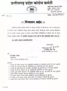 रायपुर। ब्लॉक कांग्रेस अध्यक्ष दीपक टंडन पार्टी से निष्कासित किए गए है। निष्कासित आदेश में लिखा गया है कि छत्तीसगढ़ प्रदेश कांग्रेस कमेटी के अध्यक्ष दीपक बैज के आदेशानुसार दीपक टण्डन, कार्यकारी अध्यक्ष-ब्लाक कांग्रेस कमेटी, बिलाईगढ़, जिला- सारंगढ़ बिलाईगढ़ को त्रि-स्तरीय पंचायत चुनाव के दौरान पार्टी विरोधी गतिविधियों में संलिप्त होने के कारण भारतीय राष्ट्रीय कांग्रेस की प्राथमिक सदस्यता से छः वर्षों के लिए निष्कासित किया जाता है।