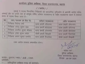राजनांदगांव। पुलिस अधीक्षक मोहित गर्ग ने जिले के चार थानों और एक पुलिस चौकी के प्रभारियों में बदलाव किया है। गुरुवार शाम को जारी ट्रांसफर आदेश में डोंगरगढ़ थाना प्रभारी जितेंद्र वर्मा को डोंगरगांव थाना प्रभारी बनाया गया है।