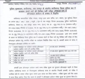 पंजीयन उपरांत ऑनलाइन आवेदन सबमिट करने की अंतिम तारीख 27 अगस्त शाम 5 बजे तक। परीक्षा की तिथि 14 सितंबर रविवार।परीक्षा समय 2 घंटे। प्रवेश पत्र जारी करने की तिथि 8 सितंबर।परीक्षा केंद्र 5 संभागीय मुख्यालयों में।