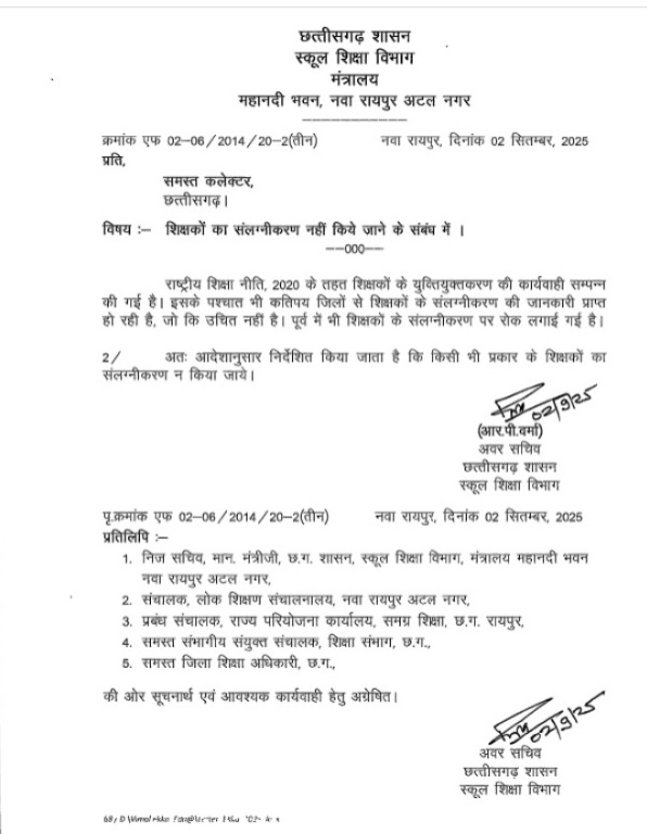 रायपुर। डीपीआई ने प्रदेशभर के कलेक्टरों को पत्र लिखकर शिक्षकों का किसी भी अन्य कार्यालयों में अटैच में ना करने की सख्त हिदायत दी है। पत्र में लिखा है कि राष्ट्रीय शिक्षा नीति, 2020 के तहत शिक्षकों के युक्तियुक्तकरण की कार्यवाही सम्पन्न की गई है। इसके पश्चात भी कतिपय जिलों से शिक्षकों के संलग्नीकरण की जानकारी प्राप्त हो रही है, जो कि उचित नहीं है। पूर्व में भी शिक्षकों के संलग्नीकरण पर रोक लगाई गई है। अतः आदेशानुसार निर्देशित किया जाता है कि किसी भी प्रकार के शिक्षकों का 2/ संलग्नीकरण न किया जाये।