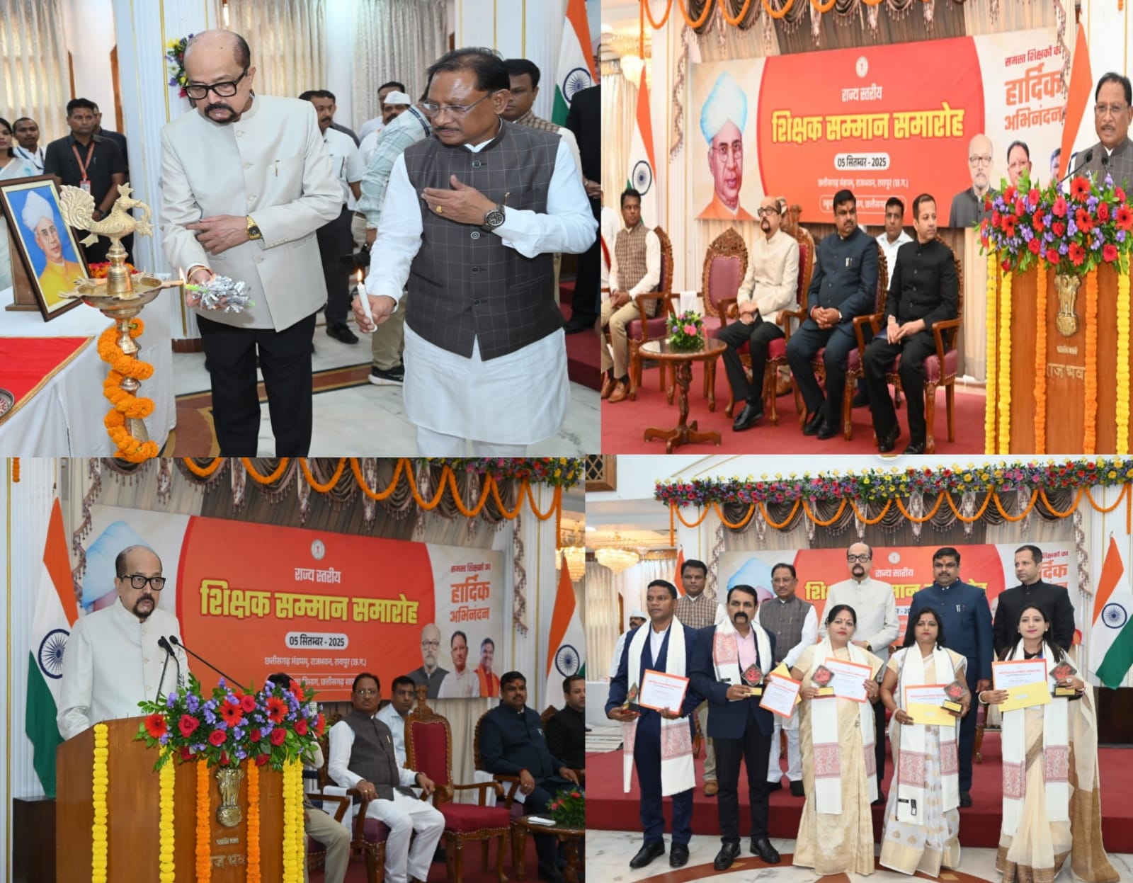 रायपुर। राज्यपाल रमेन डेका और मुख्यमंत्री विष्णु देव साय ने आज शिक्षक दिवस के अवसर पर राजभवन के छत्तीसगढ़ मण्डपम् में आयोजित गरिमामय समारोह में वर्ष 2024 के उत्कृष्ट शिक्षकों को राज्य स्तरीय सम्मान प्रदान किया।
