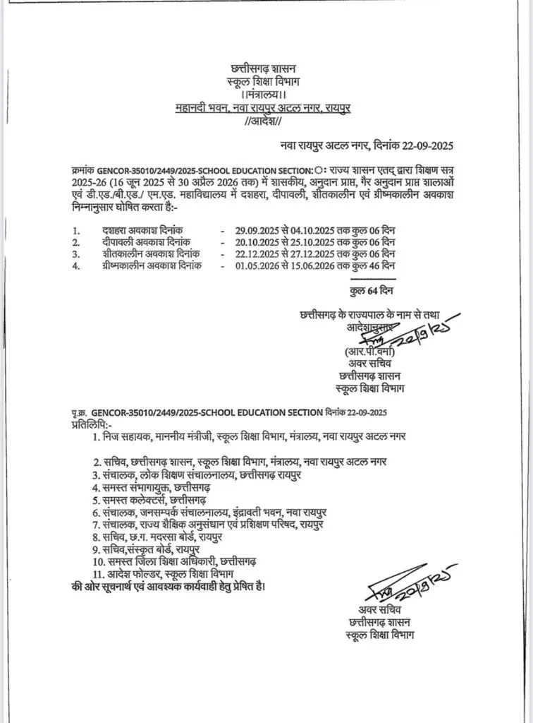 स्कूल शिक्षा विभाग, मंत्रालय महानदी भवन नवा रायपुर ने शिक्षा सत्र 2025-26 के लिए राज्य की शैक्षणिक संस्थाओं के लिए अवकाश की घोषण की है। इसमें दशहरा की छुट्टी 6 दिनों की रहेगी, जो 29 सितंबर से 4 अक्टूबर तक, दीपावली अवकाश 20 अक्टूबर से 25 अक्टूबर तक रहेगी। शीतकालीन अवकाश 22 से 27 दिसंबर तक रहेगा। इस तरह गर्मी की छुट्टियां 1 मई से 15 जून 2026 तक 46 दिन की रहेगी।