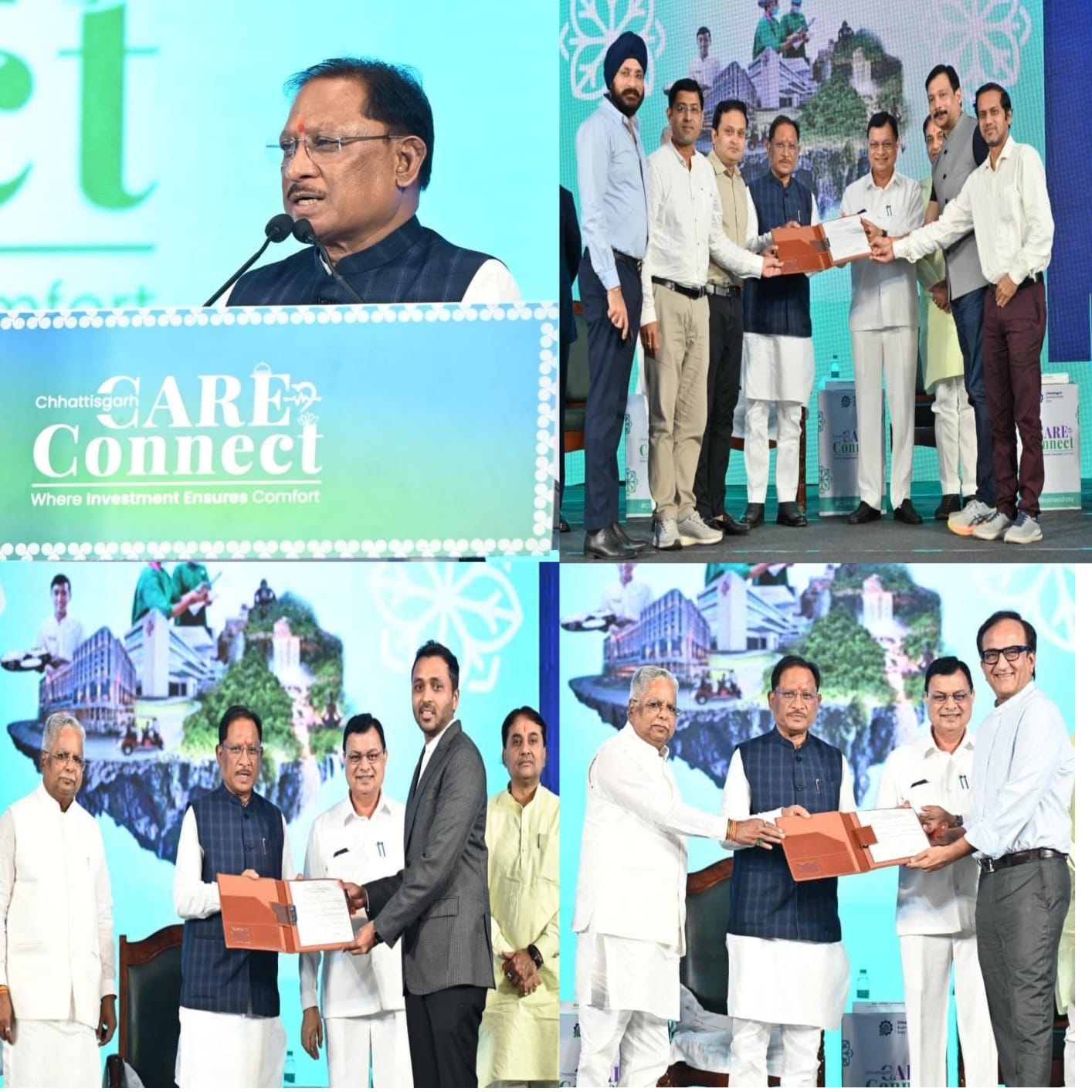 कार्यक्रम में मुंबई स्थित बॉम्बे हॉस्पिटल ट्रस्ट ने 300 बेड सुपर स्पेशलिटी हॉस्पिटल के लिए 680.37 करोड़ का निवेश प्रस्तावित किया है, जिससे 500 रोजगार उपलब्ध होंगे। माँ पद्मावती इंस्टिट्यूट ऑफ मेडिकल साइंसेज रायपुर 750 बेड क्षमता वाला मल्टी स्पेशलिटी हॉस्पिटल 340 करोड़ निवेश और 1,500 रोजगार अवसर प्राप्त होंगे। आरोग्यमृत वेलनेस एलएलपी रायपुर द्वारा इंटरनल वेलनेस ग्रोथ, हेल्थ एंड वेलनेस सेंटर की स्थापना हेतु 300 करोड़ के निवेश और 1,000 रोजगार अवसरों के साथ प्रस्तावित किया गया है। फोर सीज़न हॉस्पिटल एंड रिसर्च सेंटर रायपुर 600 बेड क्षमता और 302 करोड़ के निवेश से 1,400 रोजगार सृजित करेगा। गिन्नी देवी गोयल मणिपाल हॉस्पिटल रायपुर में 500 बेड का 307 करोड़ का मल्टी सुपर स्पेशलिटी अस्पताल प्रस्तावित है, जिसमें 100 लोगों को रोजगार मिलेगा। नीरगंगा हॉस्पिटल एंड रिसर्च सेंटर रायपुर (वंदना ग्रुप) द्वारा 450 बेड का मल्टी स्पेशलिटी हॉस्पिटल 205.23 करोड़ के निवेश और 302 रोजगार अवसरों के साथ प्रस्तावित किया गया है। मेमन हेल्थकेयर प्राइवेट लिमिटेड रायपुर 150 बेड क्षमता वाले संजीवनी सुपर स्पेशलिटी हॉस्पिटल में 101 करोड़ निवेश और 400 रोजगार अवसर लेकर आया है। मॉडर्न मेडिकल इंस्टिट्यूट रायपुर 150 बेड सुपर स्पेशलिटी हॉस्पिटल के रूप में 91.8 करोड़ के निवेश से 555 रोजगार उत्पन्न करेगा। श्रीराम संजीवनी कैंसर हॉस्पिटल बिलासपुर 100 बेड 70 करोड़ निवेश और 200 लोगों को रोजगार के साथ प्रस्तावित है।