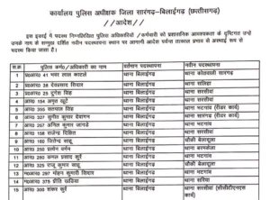 सारंगढ़-बिलाईगढ़ । छत्तीसगढ़ के सारंगढ़-बिलाईगढ़ जिले में पुलिस विभाग में बड़ा फेरबदल हुआ है। एसपी आञ्जनेय वार्ष्णेय ने 80 पुलिस कर्मियों का स्थानांतरण किया। इनमें 16 प्रधान आरक्षक और 64 आरक्षक एवं महिला आरक्षक शामिल हैं। यह आदेश प्रशासनिक दृष्टिकोण से जारी किया गया है।