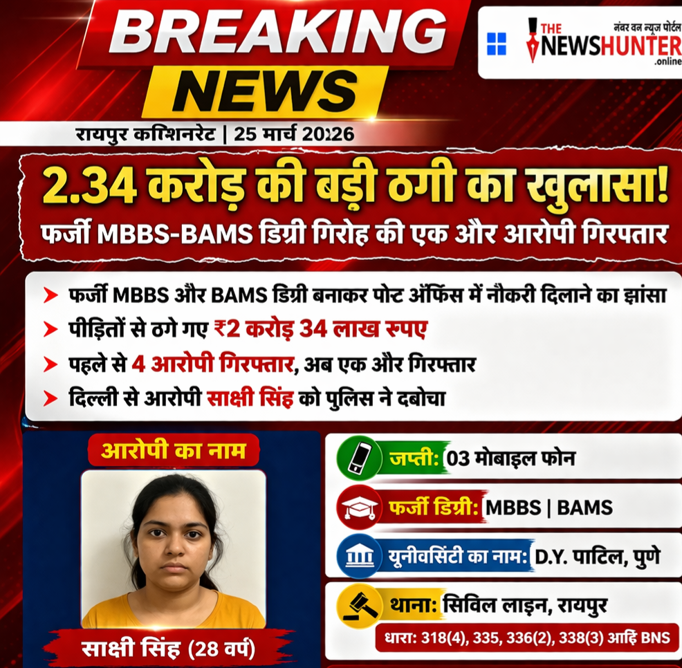 रायपुर | 25 मार्च 2026 / 2.34 करोड़ की बड़ी ठगी का खुलासा, फर्जी MBBS BAMS डिग्री गिरोह की एक और आरोपी गिरफ्तार रायपुर पुलिस को बड़ी सफलता मिली है।