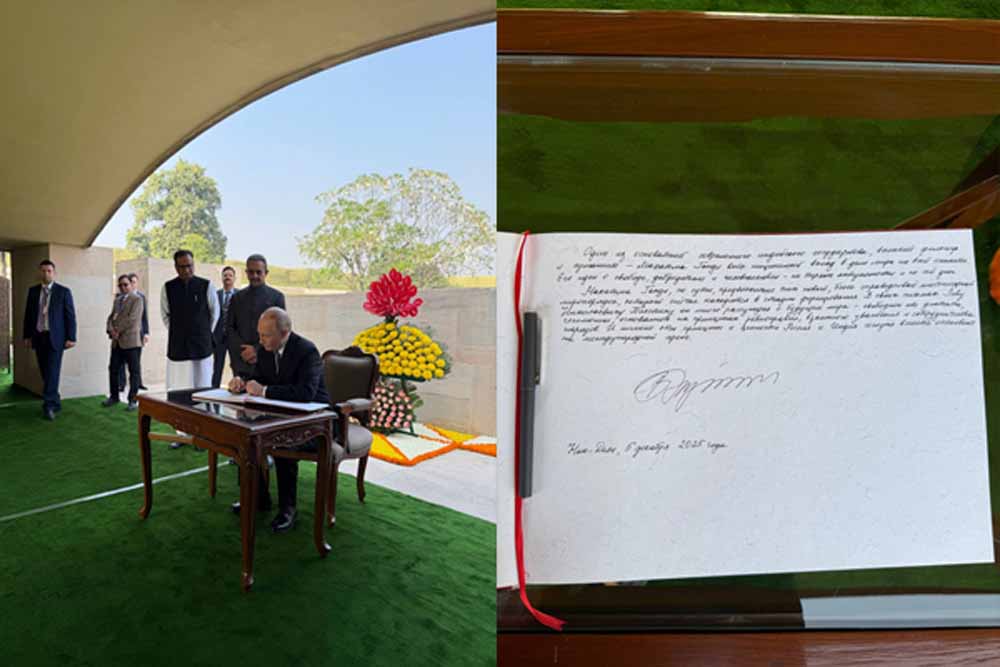रूस के राष्ट्रपति व्लादिमीर पुतिन ने शुक्रवार को राजघाट पर महात्मा गांधी को श्रद्धांजलि दी। इसके बाद रूसी राष्ट्रपति ने एक विजिटर बुक पर हस्ताक्षर भी किया, जिस पर एक संदेश लिखा था। महात्मा गांधी के लिए दिए संदेश में पुतिन ने लिखा कि आधुनिक भारत के संस्थापकों में से एक के रूप में उन्होंने विश्व शांति के लिए अमूल्य योगदान दिया। राजघाट परिसर के सम्मानीय विजिटर्स की बुक पर हस्ताक्षर करते हुए, पुतिन ने कहा कि महात्मा गांधी ने नए, ज्यादा न्यायपूर्ण, बहुध्रुवीय विश्व व्यवस्था का अंदाजा लगाया था जो अभी अपने शुरुआती दौर में है।