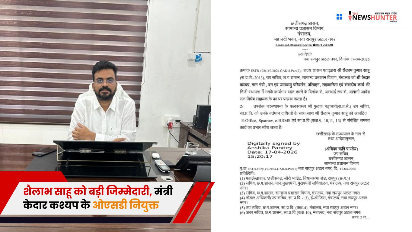 17 अप्रैल 2026 को जारी इस आदेश में बताया गया है कि शैलाभ साहू, जो वर्तमान में सामान्य प्रशासन विभाग में उप सचिव के पद पर कार्यरत हैं, उन्हें मंत्री के निजी स्थापना में अस्थायी रूप से आगामी आदेश तक विशेष सहायक के पद पर पदस्थ किया गया है।