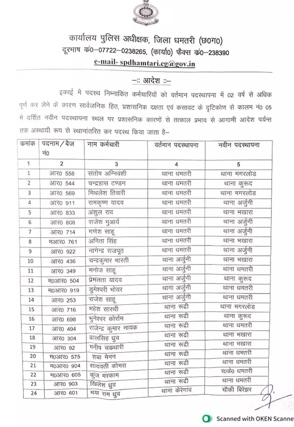 धमतरी। पुलिस अधीक्षक सूरज सिंह परिहार के मार्गदर्शन में धमतरी जिले में पदस्थ आरक्षकों के लिए एक सुव्यवस्थित और पारदर्शी स्थानांतरण प्रक्रिया अपनाई गई है। इस प्रक्रिया के तहत दो वर्ष से अधिक समय से एक ही स्थान पर तैनात आरक्षकों का बड़े पैमाने पर तबादला किया गया है।