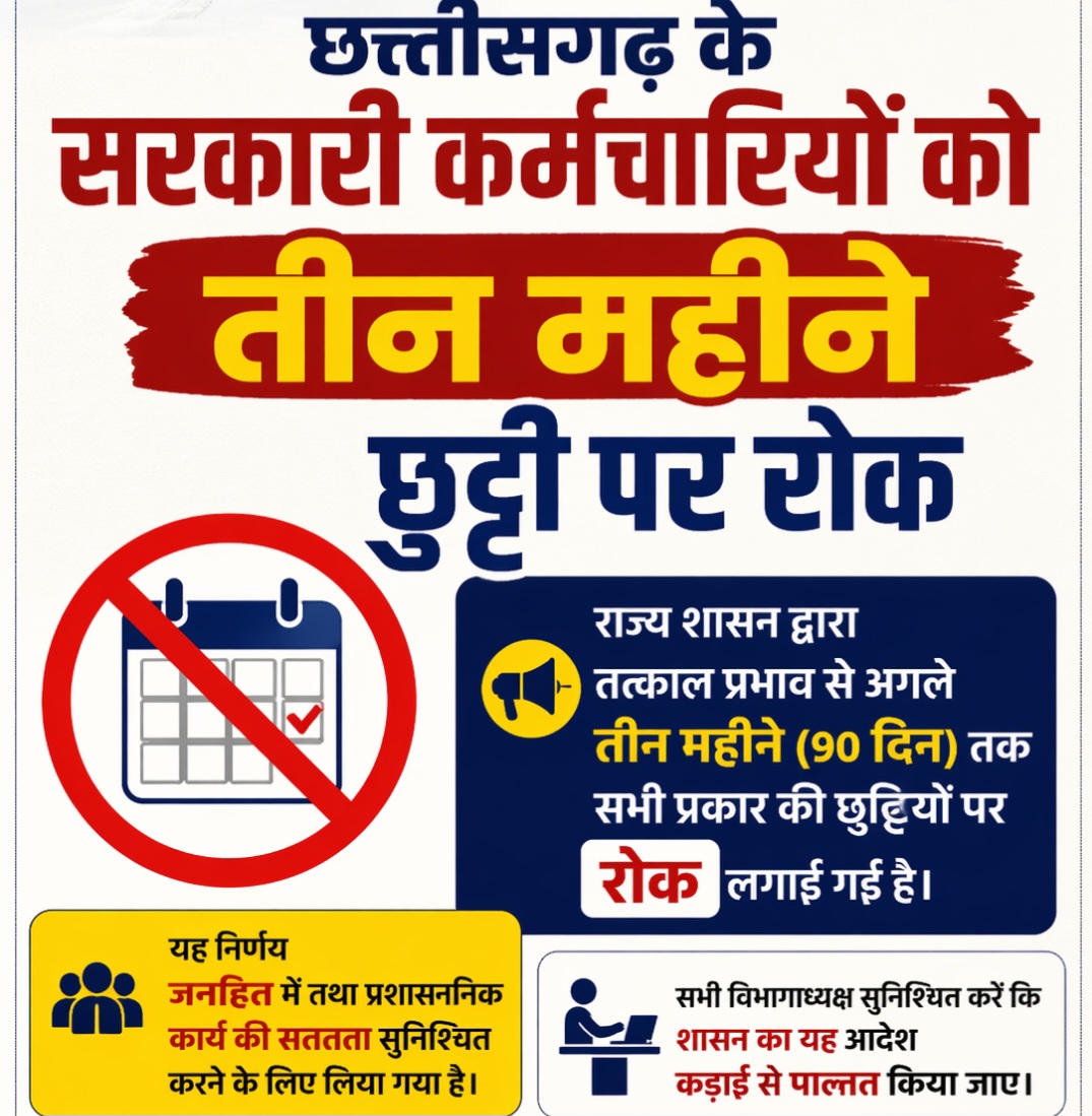 रायपुर / छत्तीसगढ़ के सरकारी कर्मचारियों के लिए एक महत्वपूर्ण अपडेट है,जनगणना और सुशासन तिहार को ध्यान में रखते हुए तीन महीने के लिए छुट्टियों पर रोक लगा दी गई है। अब कर्मचारी बिना पूर्व अनुमति के छुट्टी पर नहीं जा सकेंगे।यदि कोई कर्मचारी बिना अनुमति अनुपस्थित रहता है, तो इसे सेवा में बाधा मानते हुए अनुशासनात्मक कार्रवाई की जाएगी।