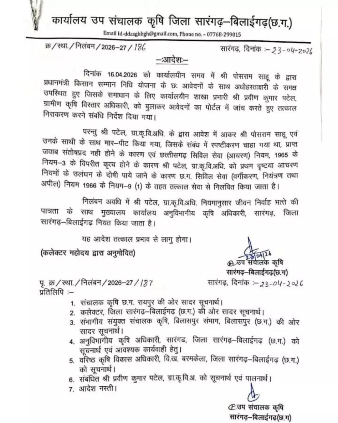 सारंगढ़-बिलाईगढ़। छत्तीसगढ़ के सारंगढ़-बिलाईगढ़ जिले में पत्रकार से मारपीट करने के मामले में कृषि विभाग ने कड़ी कार्रवाई करते हुए ग्रामीण कृषि विस्तार अधिकारी प्रवीण पटेल को निलंबित कर दिया है।