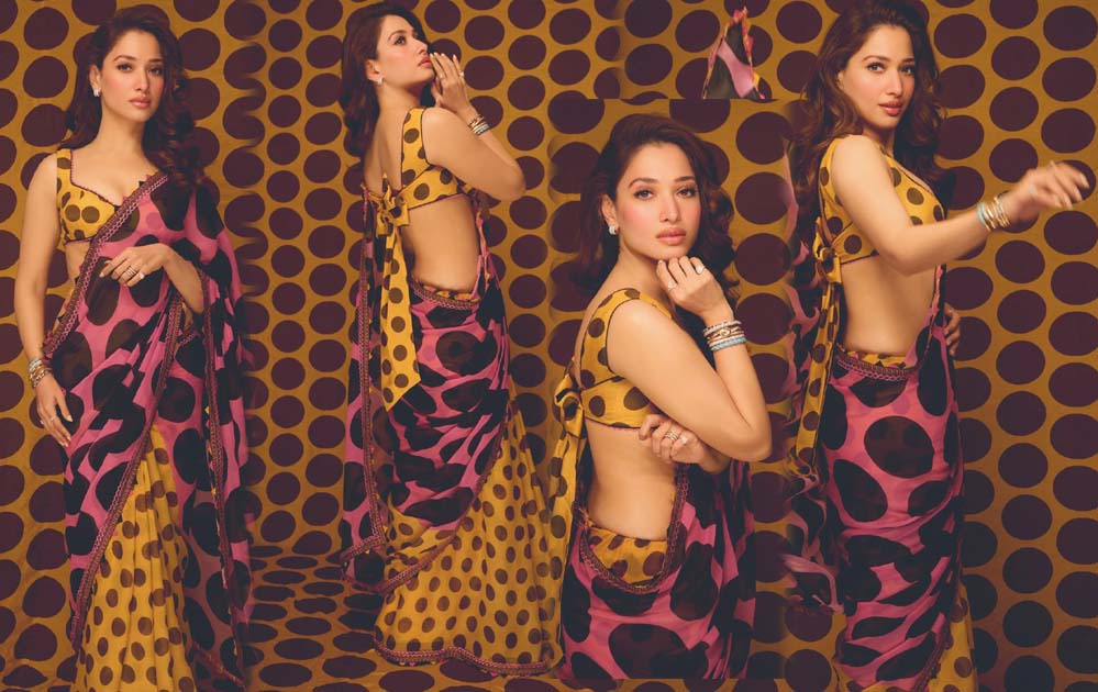 सबसे पहले, बोल्ड पोल्का डॉट्स आपका ध्यान खींचते हैं। साड़ी में सरसों पीला और गहरा गुलाबी जैसे विपरीत रंगों का मेल है। इस पर बड़े-बड़े काले डॉट्स की लेयरिंग की गई है जो बॉलीवुड प्रिंट्स और 70 के दशक के फैशन की याद दिलाती है। यह बोल्ड और बेबाक है – तमन्नाह के स्टाइल से पूरी तरह मेल खाती है। यह साड़ी पूरे लुक में सही मात्रा में नाटकीयता जोड़ रही है। इसे साफ-सुथरा और पारंपरिक रखने के बजाय, साड़ी स्वतंत्र रूप से लहरा रही है, और पल्लू को इस तरह स्टाइल किया गया है जो किसी फिल्म की याद दिलाता है।