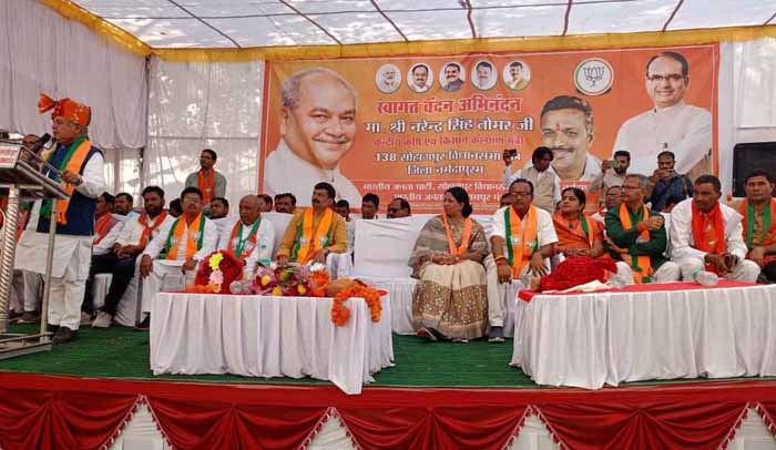 यह बात केंद्रीय मंत्री और प्रदेश चुनाव समिति के संयोजक श्री नरेंद्र सिंह तोमर ने नर्मदापुरम जिले की सोहागपुर विधानसभा से भाजपा प्रत्याशी श्री विजयपाल सिंह के समर्थन में जनसभा को संबोधित करते हुए कही। श्री तोमर ने कहा कि एक बार फिर भाजपा की सरकार विकास के नाम पर बनेगी। किसानों से लेकर युवाओं को रोजगार मिले इस दिशा में प्रदेश की भाजपा सरकार ने काम किया है। किसानों के लिए एग्रीकल्चर एग्जीबिशन के अलावा किसानों को फसल बीमा तक की सुविधा प्रदेश सरकार ने दी है। श्री तोमर ने रायसेन जिले के सोहागपुर, सांची और उदयपुरा विधानसभाओं में पार्टी प्रत्याशियों के समर्थन में जनसभा को संबोधित किया।