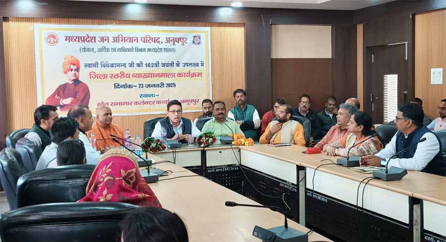 कलेक्टर श्री हर्षल पंचोली ने कहा है कि स्वामी विवेकानंद जी के जीवन चरित्र और उनके दर्शन का अध्ययन युवा अनिवार्य रूप से करें। उनके जीवन और आदर्शों को याद करें, उन्हें समझें और उनसे प्रेरणा लेकर स्वयं और देश के उत्थान के लिए कार्य करे। सभी युवा अपने सामर्थ्य, क्षमता, ऊर्जा और ओज को राष्ट्र निर्माण में लगाए। उन्होंने कहा कि स्वामी विवेकानंद जी के कार्यों और विचारों से प्रेरणा लेकर हमें राष्ट्र सेवा के प्रति समर्पित होना चाहिए एवं प्रत्येक युवा को स्वामी विवेकानंद जी के विचारों को अपने जीवन में आत्मसात कर आगे बढ़ना चाहिए। कलेक्टर श्री हर्षल पंचोली आज कलेक्ट्रेट स्थित सोन सभागार में जन अभियान परिषद अनूपपुर द्वारा आयोजित ‘‘भारत का उत्कर्ष-स्वामी विवेकानंद जी’’ विषय पर जिला स्तरीय व्याख्यान कार्यक्रम को संबोधित कर रहे थे।
