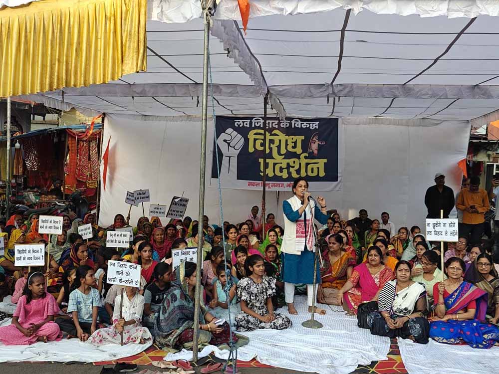 नादरा बस स्टैंड पर विराट विरोध प्रदर्शन इस अवसर पर सैकड़ों की तादाद में महिलाएं एवं बेटियां उपस्थित रही।कार्यक्रम में प्रतीकात्मक रूप से आरोपित को फांसी पर भी लटकाया गया। ओल्ड भोपाल के वाजपेई नगर मल्टी में हजारों की संख्या में महिलाएं शस्त्र लेकर उतरी मैदान में। लव जिहाद के खिलाफ आरोपितो को फांसी की सजा की मांग की। पहचान छुपाकर मासूम छात्राओं को बना रहे लव जिहाद का शिकार ऐसे आरोपियों को कड़ी से कड़ी सजा देने की मांग।