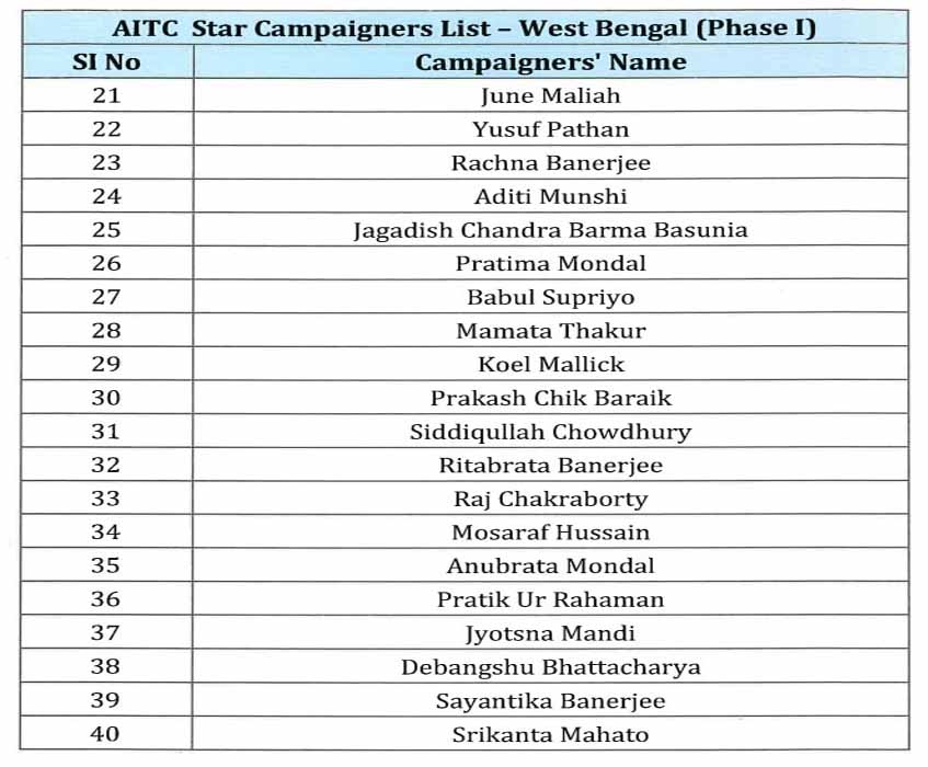 पहले चरण के लिए जारी सूची में सिर्फ शीर्ष नेतृत्व ही नहीं, बल्कि संगठन के अनुभवी और भरोसेमंद चेहरों को भी जगह दी गई है. वरिष्ठ मंत्री फिरहाद हकीम, पार्टी के अनुभवी नेता सुब्रत बख्शी, चंद्रिमा भट्टाचार्य और कल्याण बनर्जी जैसे नाम इस सूची में शामिल हैं.