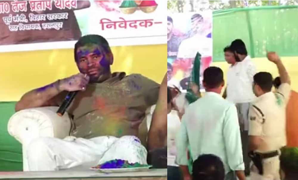 तेज प्रताप यादव ने होली मनाते हुए होली का गीत गाया और बिहार पुलिस के जवान को धमकी देते हुए ठुमके भी लगवाए। अब यह वीडियो सोशल मीडिया पर वायरल है। इस वायरल वीडियो में तेज प्रताप यादव धमकी देते हुए नजर आ रहे हैं। तेज प्रताप यादव ने कहा कि दीपक ठुमके लगाओ वरना सस्पेंड कर दिए जाओगे। मजबूरी में तेज प्रताप यादव की सुरक्षा में तैनात पुलिस कर्मी ने ठुमके भी लगाए। अब इस वीडियो के वायरल होने के बाद पुलिस विभाग की भी किरकिरी हो रही है। इस मामले पर अब लोग यह कह रहे हैं कि तेज प्रताप यादव और राजद सुप्रीमो के बड़े बेटे सत्ता जाने के बाद भी हनक बनाए हुए हैं।