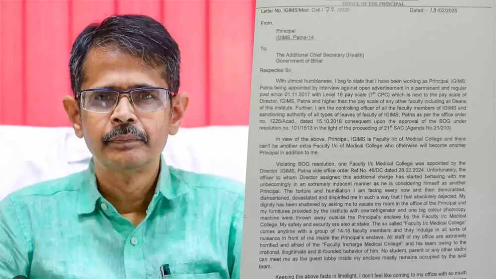 बिहार की राजधानी पटना से बड़ी खबर सामने आई है। IGIMS के प्राचार्य डॉ रंजीत गुहा ने आत्महत्या करने की चेतावनी दी है। उन्होंने मुख्यमंत्री नीतीश कुमार और स्वास्थ्य मंत्री मंगल पांडेय को पत्र लिखा है। उन्होंने IGIMS में प्रताड़ित किए जाने का आरोप लगाया है। डॉ गुहा ने एनाटॉमी के HOD पर प्रताड़ित करने और अभद्र व्यवहार करने का आरोप लगाया है। उन्होंने कहा है कि वे अब पूरी तरह से निराश और तबाह हो चुके हैं।