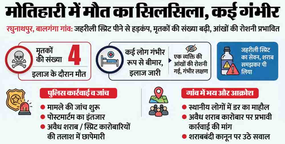 मोतिहारी रघुनाथपुर थाना क्षेत्र के बालगंगा गांव में जहरीली स्प्रिट (शराब) पीने से लोगों की मौत का सिलसिला लगातार जारी है। कल एक व्यक्ति की मौत हुई थी, वहीं दो अन्य गंभीर रूप से बीमार हो गए थे। इसके अलावा एक व्यक्ति की आंखों की रोशनी चले जाने की खबर ने इलाके में हड़कंप मचा दिया।