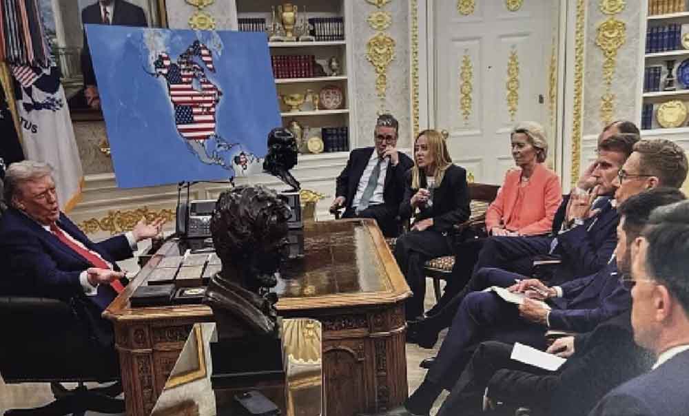 ट्रंप द्वारा शेयर किए गए इस नक्शे में अमेरिका का आकार काफी बड़ा दिखाया गया है। इसमें पड़ोसी देश कनाडा, दक्षिण अमेरिकी देश वेनेजुएला और डेनमार्क के अधीन ग्रीनलैंड को अमेरिकी क्षेत्र बताया गया है। इसके साथ ट्रंप ने एक और तस्वीर भी पोस्ट की, जिसमें वह उप-राष्ट्रपति जेडी वेंस और अपने विदेश मंत्री मार्को रूबियो के साथ ग्रीनलैंड में अमेरिकी झंडा लगाते नजर आ रहे हैं। उस तस्वीर पर लिखा है- “Greenland US Territory Est 2026” यानी ग्रीनलैंड, अमेरिकी क्षेत्र – स्थापना- 2026